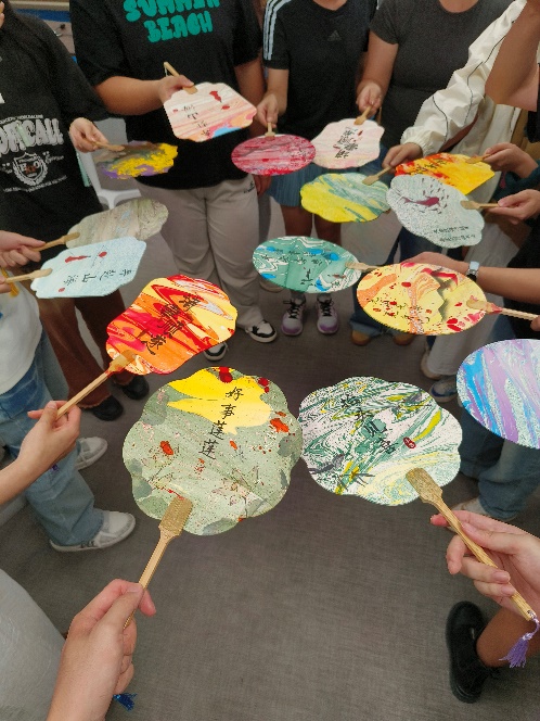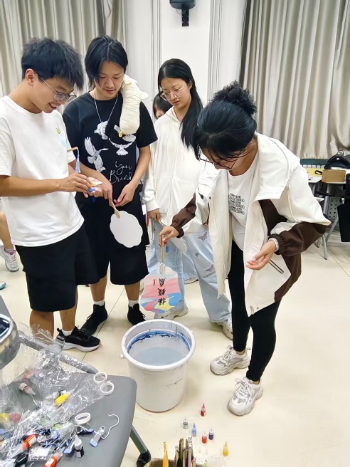 随着夜幕降临,活动进入最后的“漆扇DIY”环节。各色颜料滴入水中,在涟漪中自然交融,再覆于扇面之上,晕染出一幅幅精美的图案纹样——这恰似性格各异、各有所长的同学们,怀揣着热忱汇入经管大家庭,携手勾勒出和谐温馨的集体画卷。同学们纷纷感叹道, “亲手体验这样的非遗技艺、完成一件独一无二的作品,这份成就感格外珍贵。”